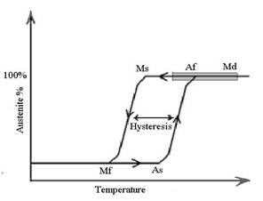 The temperature range for the martensite-to-austenite transformation, i.e. soft-to-hard transition that takes place upon heating is somewhat higher than that for the reverse transformation upon cooling (Fig. 1). The difference between the transition temperatures upon heating and cooling is called hysteresis. Hysteresis is generally defined as the difference between the temperatures at which the material is in 50 % transformed to austenite upon heating and in 50 % transformed to martensite upon cooling. This difference can be up to 20-30 °C [Buehler et al., 1967].