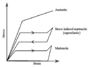 The composition and metallurgical treatments have dramatic impacts on the above transition temperatures. From the point of view of practical applications, NiTi can have three different forms: martensite, stress-induced martensite (superelastic), and austenite. When the material is in its martensite form, it is soft and ductile and can be easily deformed. Superelastic NiTi is highly elastic (rubber-like), while austenitic NiTi is quite strong and hard (similar to titanium) (Fig. 2). The NiTi material has all these properties, their specific expression depend on the temperature and stress in which it is used. Fig. 1 Md represents the highest temperature to strain-induced martensite and the grey area shows the area of optimal superelasticity.