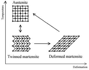 A NiTi specimen will deform until it consists only of the correspondent variant, which produces maximum strain. However, deformation beyond this will result in classical plastic deformation by slip, which is irretrievable and therefore has no “memory effect”. If the deformation is halted midway, the specimen will contain several different correspondence variants [Pritschow, 1998]. If such a specimen is heated above Af, a parent phase with an orientation identical to that existing prior to the deformation is created from the correspondence variants in accordance with the lattice correspondences between the original parent phase and each variant (Fig. 3). The austenite crystal structure is a simple cubic structure, while martensite has a more complex rhombic structure. This phenomenon causes the specimen to revert completely to the shape had before the deformation [Gill et al., 1998].