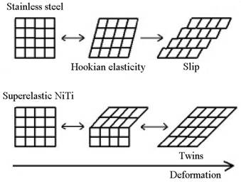 While most metals can be deformed by slip or dislocation, NiTi responds to stress by simply changing the orientation of its crystal structure through the movement of twin boundaries.
