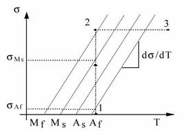 The transformation temperatures (Ms, Mf, As, Af) depend on the stress in the wire. This dependence rule is calculated with the following equation (see Fig 7):